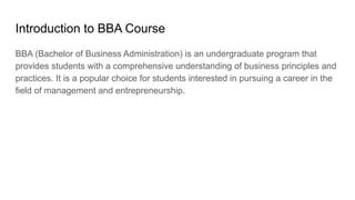 The Bachelor of Business Administration (BBA) is an undergraduate program that equips students with a solid understanding of business principles and practical skills. It offers various specializations like marketing and finance, emphasizes skill development through practical exercises, and provides industry exposure through internships and guest lectures. BBA graduates enjoy diverse career prospects across multiple sectors and may further their education with an MBA.