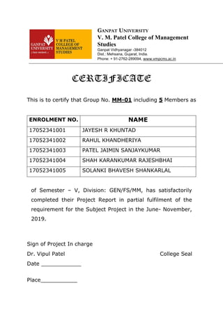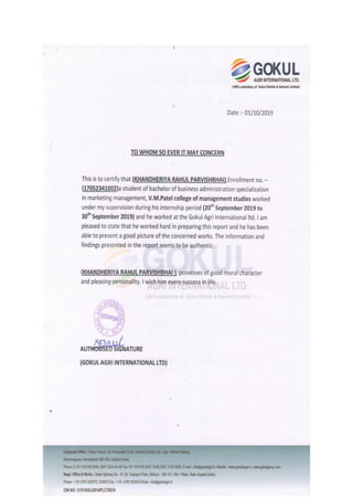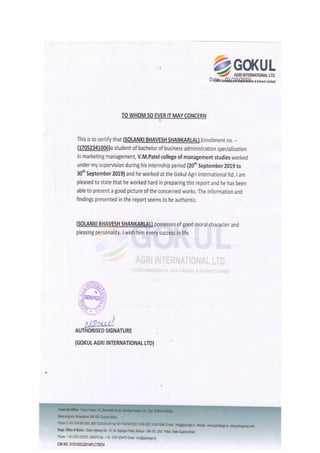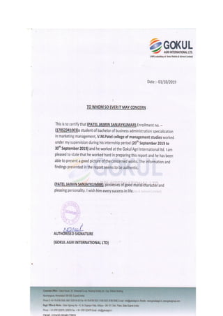 This document is a project report created by a group of students from V.M. Patel College of Management Studies for their practical study of the marketing department at Gokul Agri International Ltd. during a 10-day period in 2019. It includes an overview of the company's operations, history, vision, and organizational structure, along with insights into its human resources, finance, production, and marketing departments. The report highlights their learning experiences and gratitude towards mentors and company staff for their support during the project.
