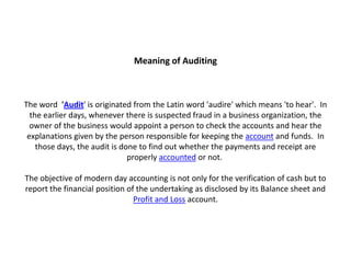 1. The document outlines the syllabus for an auditing course, covering topics such as the meaning, objectives, and advantages of audits; types of audits; internal check systems; vouching of transactions; verification and valuation of assets and liabilities; auditing of limited companies, banking/insurance companies, and co-operative societies.