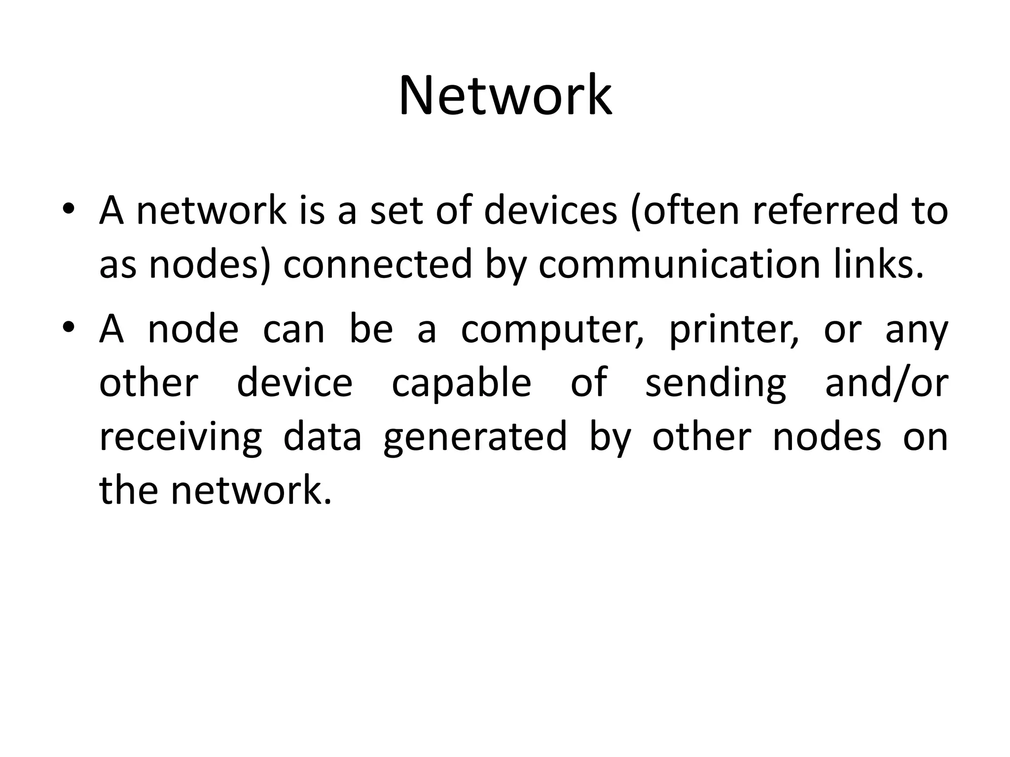 A network connects devices like computers and printers through communication links. There are two types of connections: point-to-point between two nodes, and multipoint between more than two nodes. Setting up a computer network provides advantages like file sharing, resource sharing, centralized storage, improved communication, and faster problem solving. However, networks also have disadvantages such as high costs, security concerns like viruses, and a lack of robustness if the main server fails.