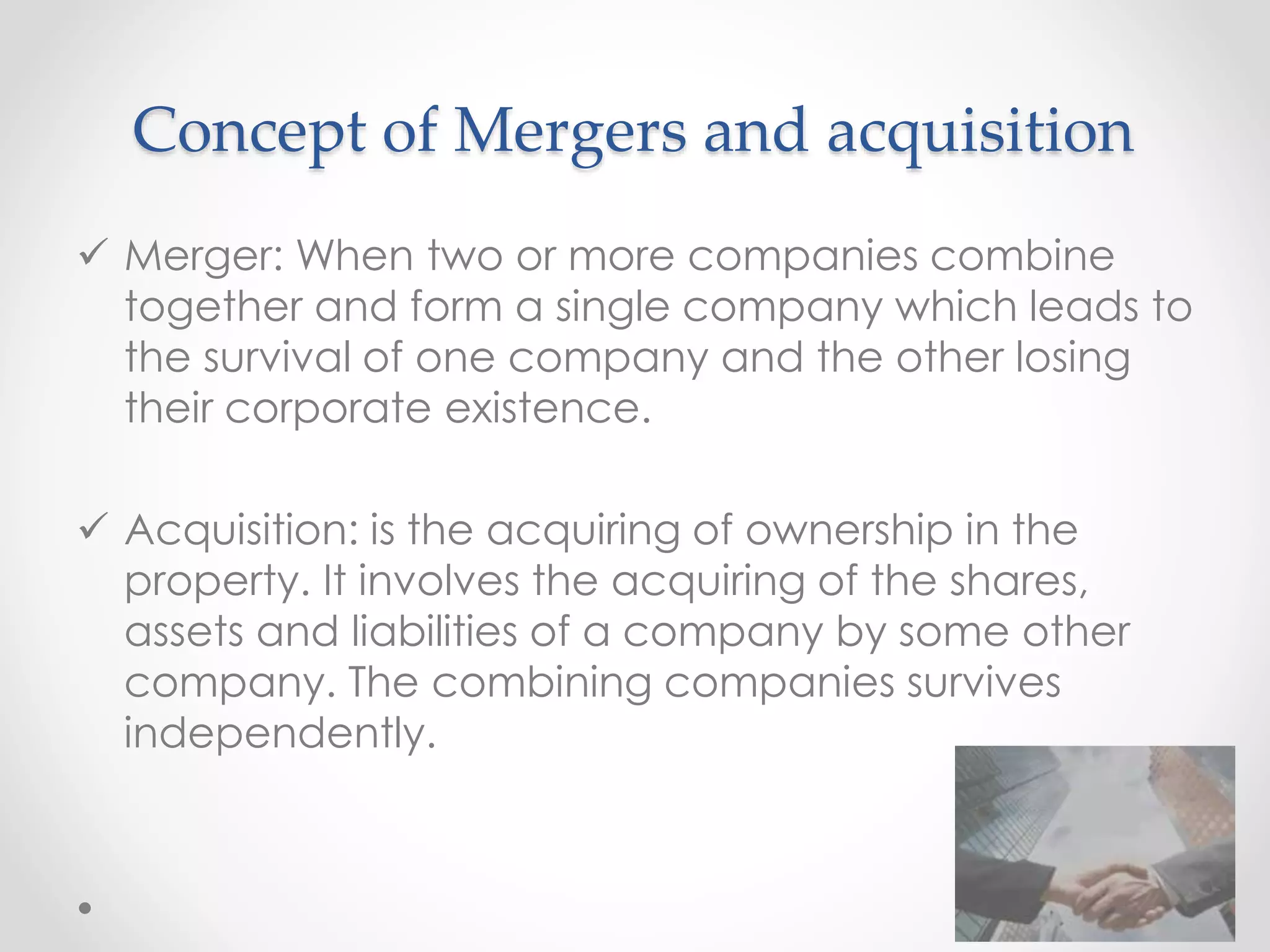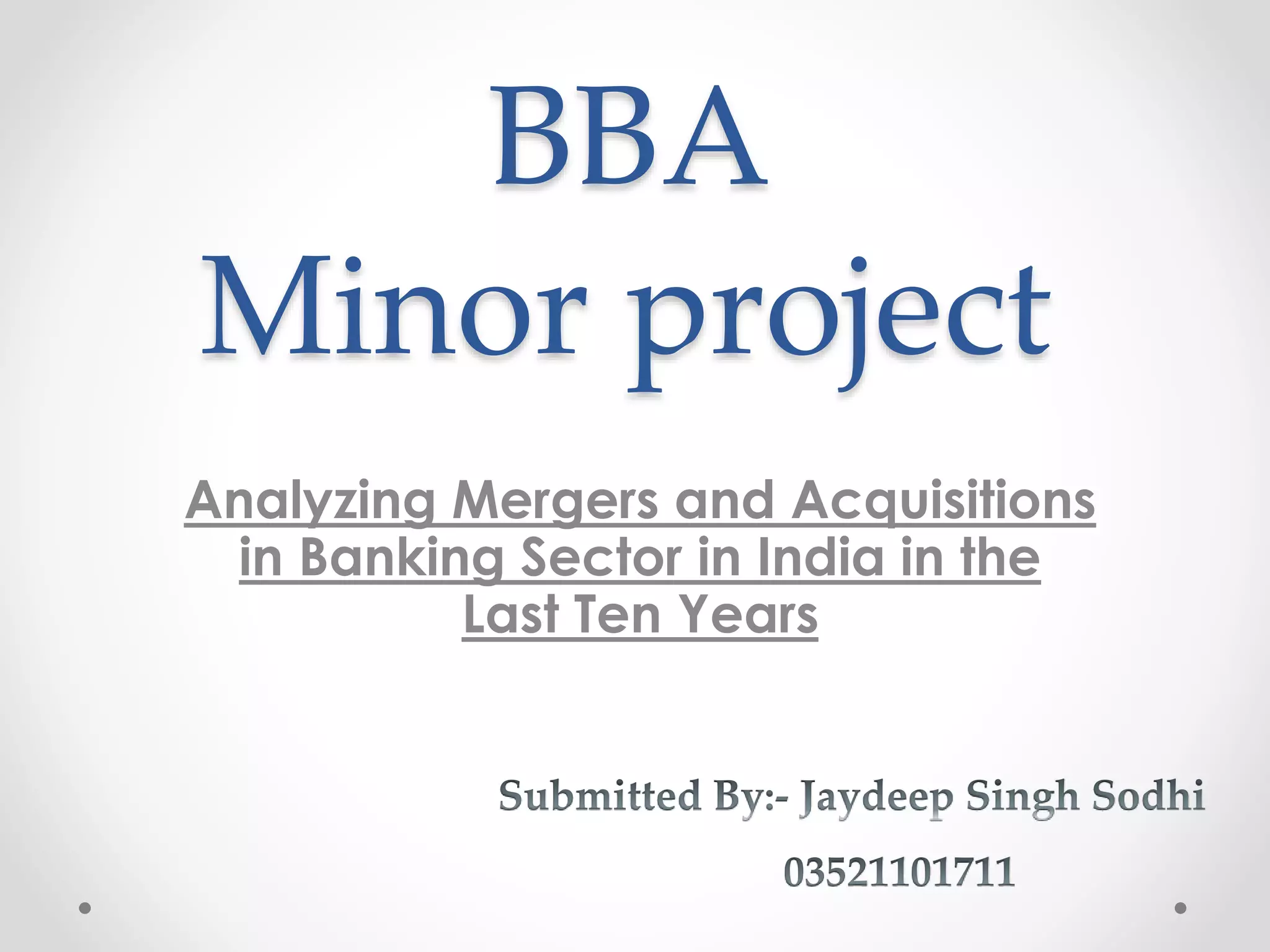 This document discusses mergers and acquisitions in the Indian banking sector over the last ten years. It defines mergers and acquisitions, describes different types of each, and provides examples of four mergers/acquisitions between Indian banks: HDFC acquiring Centurion Bank of Punjab in 2008; Bank of Baroda acquiring South Gujarat Local Area Bank in 2004; IDBI acquiring United Western Bank in 2006; and Oriental Bank of Commerce acquiring Global Trust Bank in 2004. Each example outlines the rationale, benefits, and potential drawbacks of the transaction. The conclusion emphasizes that mergers and acquisitions can promote business restructuring, competitiveness, and shareholder value in the banking industry.