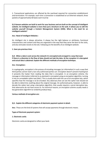 This document contains an assignment for a BBA student in the subject of E-Commerce. It includes 6 questions to be answered about various topics related to e-commerce including opportunities for businesses using e-commerce, advantages and disadvantages of e-commerce, characteristics of gateways in the TCP/IP reference model, the need for intelligent websites, encryption techniques, types of electronic payment systems, and examples of internet services. The student is asked to answer all questions in detail, with some answers requiring approximately 400 words. Questions cover topics such as opportunities in e-commerce, advantages and disadvantages of e-commerce, TCP/IP gateways, intelligent websites, encryption methods, electronic payment systems, and examples of internet services like email.