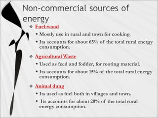 This document discusses India's physical infrastructure and energy sources. It notes that energy, including coal, electricity, oil, and non-conventional sources, is a key part of infrastructure that facilitates economic growth. Coal and lignite currently make up the majority of India's energy, with coal reserves expected to last 100 years, though production and consumption of coal, oil, and electricity have all increased significantly since 1950. Non-commercial energy sources like fuelwood, agricultural waste, and animal dung make up over 65% of India's total energy.