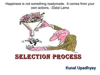 The document discusses the selection process used by HR departments to hire new employees. It describes the key steps as preliminary interviews, selection tests to assess abilities, aptitudes and personality, employment interviews either one-on-one or with a panel, reference and background checks, making a final selection decision, requiring potential new hires to pass a physical examination, extending a formal job offer letter, having the new hire sign an employment contract, and finally evaluating the effectiveness of the overall selection program. The document also provides details on different types of interviews and selection tests used at each stage of the process.