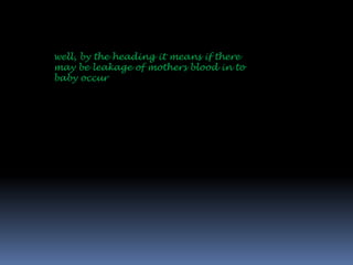 This document discusses a medical condition that can occur during pregnancy where a mother's blood can leak into the baby, which can sometimes result in the baby dying in the womb. It emphasizes the importance of properly treating this condition according to need in order to ensure the health of both the mother and baby.