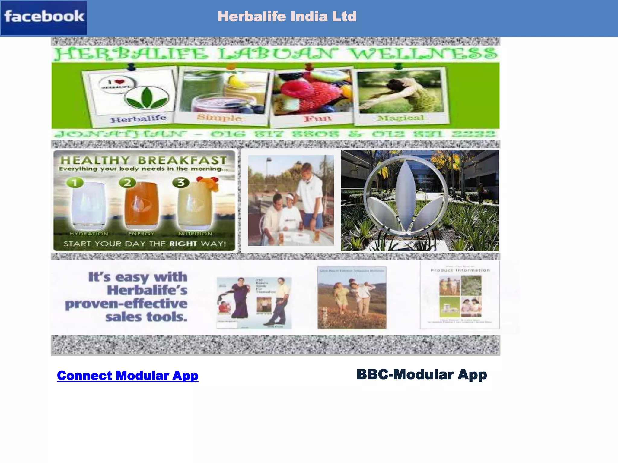 The document discusses a modular app created by Herbalife India Ltd that contains BBC content. The app allows users to access modular content like blogs and pages through a timeline and table of contents. It also provides navigation options to connect, download, and go to the main app or content pages.