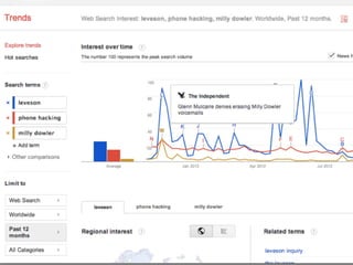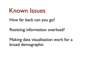 The document discusses designing a timeline tool to help users explore and understand complex news stories over time by highlighting key details and events. It proposes visualizing related content across BBC platforms within an interactive timeline interface that allows zooming in and out. Examples of stories that could be depicted include the Leveson Inquiry, Premier League seasons, and the Hillsborough disaster. The document outlines initial design concepts, potential use cases, and priorities for a pilot version, as well as future enhancements like bookmarking events and comparing narratives. Key challenges mentioned are ensuring usability, managing information density, and accessing suitable historical data.
