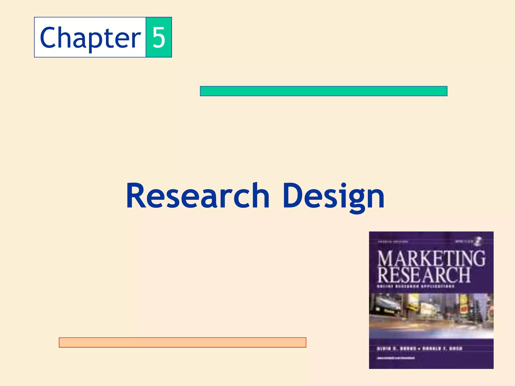 The research design chapter discusses three main types of research designs: exploratory, descriptive, and causal. Exploratory research is used to gain background information and develop hypotheses. Descriptive research aims to describe phenomena through cross-sectional and longitudinal studies. Causal research determines cause-and-effect relationships through experiments that manipulate independent variables to measure effects on dependent variables. Test marketing is a type of field experiment used to test new products or marketing mix variations in real-world market settings.