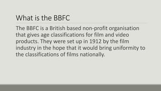The BBFC is a British non-profit organization established in 1912 to provide age classifications for films and videos shown in UK cinemas and sold on DVDs/videos. They assign ratings of U, PG, 12A, 12, 15, and 18 based on the level of violence, language, sexual content and other factors. The document discusses the criteria for each rating in detail. For their new film project, the document's author determines that a 15 rating is most suitable due to scenes of strong violence, the depiction of a deteriorating psychological state, and frequent strong language.