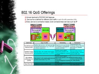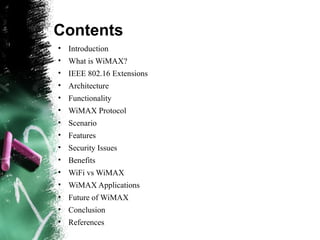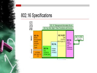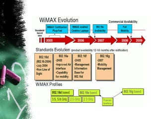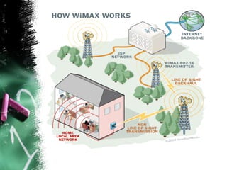WiMAX is a wireless technology that can provide broadband access over long distances. It uses wireless transmission in the 2-11 GHz range to connect users to a base station up to 50 km away. From the base station, users can access the internet and other public networks at speeds up to 70 Mbps shared among users. WiMAX allows both line-of-sight and non-line-of-sight connections using adaptive burst profiles. It has the potential to provide high-speed wireless internet access to areas not reached by cables and DSL.