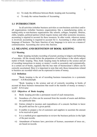 This document provides an introduction to accounting, including definitions and objectives of bookkeeping and accounting. It discusses the key differences between bookkeeping and accounting, and covers topics like the double-entry accounting system, types of accounts, and branches of accounting. The document is the first lesson in an accounting course, aiming to explain the basic concepts and terminology used in accounting.