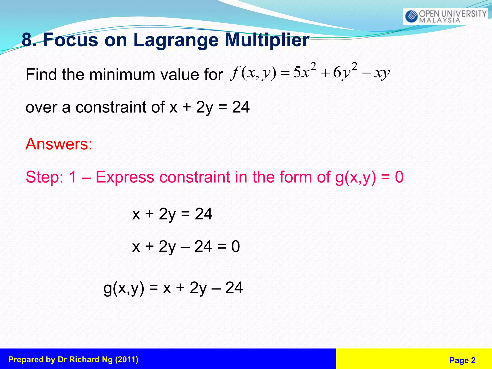 This document summarizes steps to solve constrained optimization problems using Lagrange multipliers. It provides an example of finding the minimum value of the function f(x,y)=5x^2-6y^2-xy subject to the constraint x+2y=24. The steps are: [1] Express the constraint as g(x,y)=0, [2] Form the Lagrange function F(x,y,λ)=f(x,y)-λg(x,y), [3] Take partial derivatives and set equal to 0, [4] Solve the system of equations for a minimum of (6,9). Additional practice problems and questions are also presented.