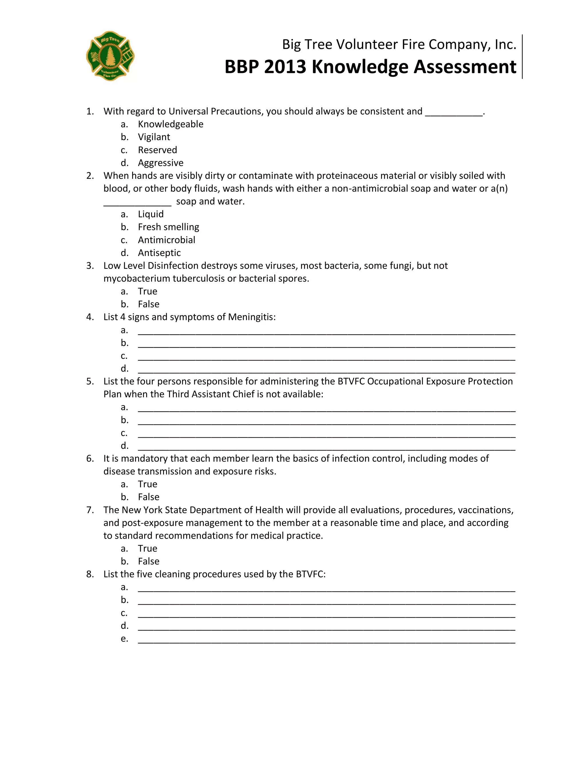 This document contains a knowledge assessment for Big Tree Volunteer Fire Company members with questions on universal precautions, hand washing, disinfection, signs of meningitis, who is responsible for administering the occupational exposure plan, the importance of learning infection control, post-exposure management, and cleaning procedures. The assessment includes multiple choice and fill-in-the-blank questions to test members' understanding of safety protocols.