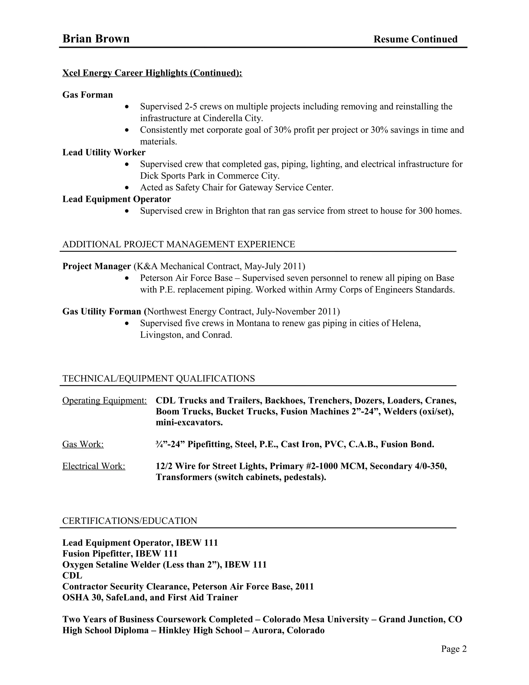 Brian Brown has over 16 years of experience in oil field and utility infrastructure development, seeking a position as an Environmental Health and Safety Trainer. He has a proven track record of developing and implementing successful safety training programs that have led to dramatic reductions in incident rates. Brown is skilled in leadership, project management, safety training, and equipment operation, with professional certifications and experience in gas piping, electrical work, and operating machinery.