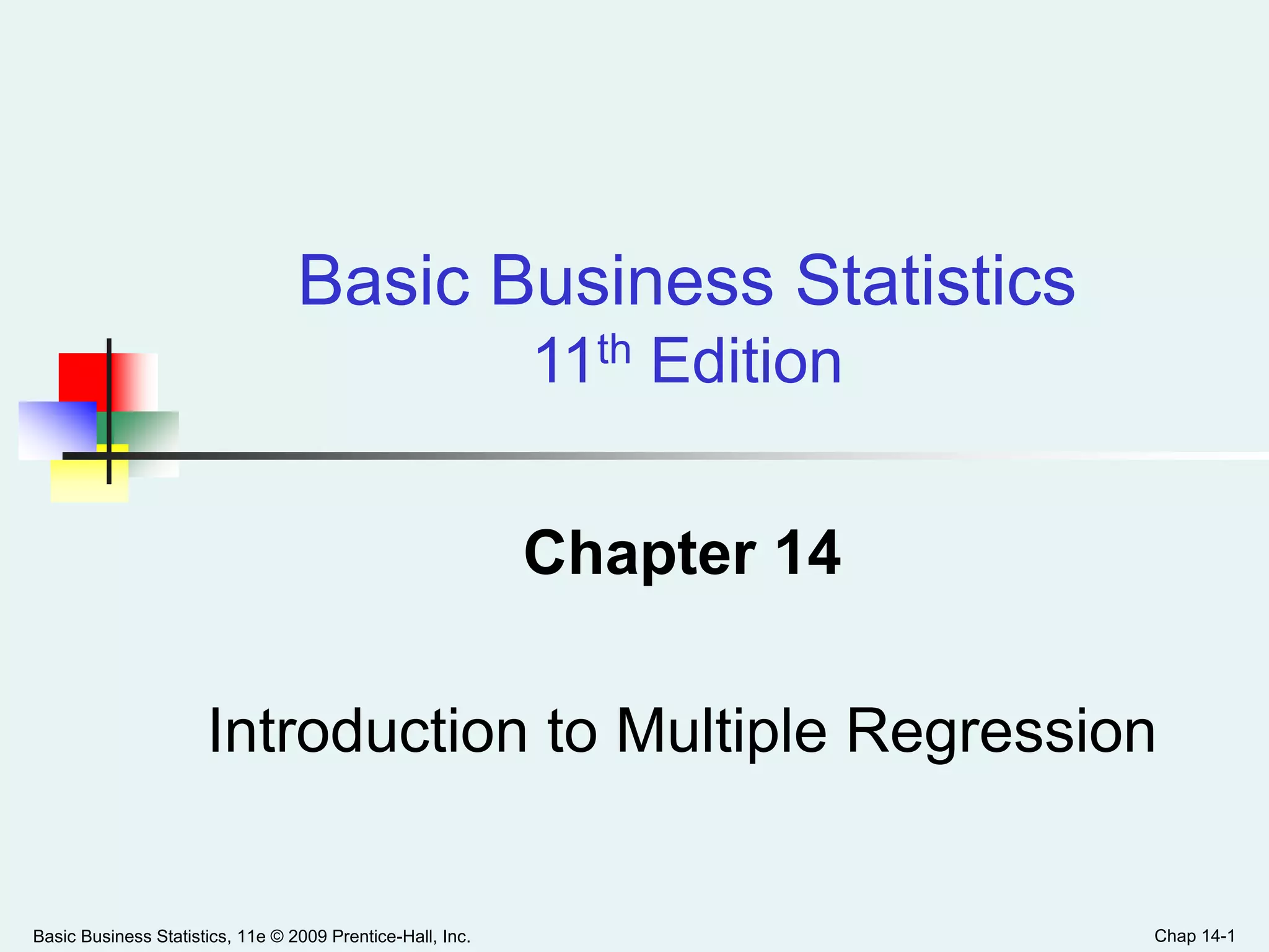 This document provides an overview of multiple regression analysis. It introduces the concept of using multiple independent variables (X1, X2, etc.) to predict a dependent variable (Y) through a regression equation. It presents examples using Excel and Minitab to estimate the regression coefficients and other measures from sample data. Key outputs include the regression equation, R-squared (proportion of variation in Y explained by the X's), adjusted R-squared (penalized for additional variables), and an F-test to determine if the overall regression model is statistically significant.