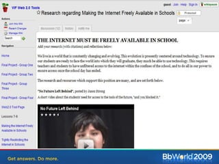 The document discusses the integration of social web tools into the Blackboard learning portal to enhance teaching and learning experiences. It highlights how recent web changes have created opportunities for redesigning traditional courses through tools like social bookmarking, blogs, and wikis. The authors emphasize the importance of collaborative learning and sharing resources among students.