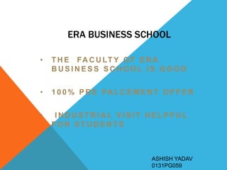 ERA Business School provides a good faculty, 100% placement assistance for students, and helpful industrial visits to support student learning and career opportunities.