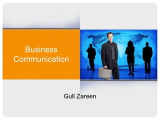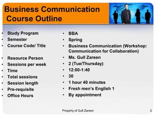 The document outlines a course on business communication taught by Gull Zareen. It provides details on the semester, course code, instructor, schedule, objectives, and assessment breakdown. The course aims to enhance written and oral communication skills for business. Key topics include communication goals and techniques, effective listening and presentation skills, and integrating technology into professional communications. Students will complete assessments including quizzes, projects and a final exam.