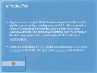 This document provides information about Argentina. It discusses that Argentina is a large country in South America bordered by Chile, Bolivia, Paraguay and Brazil. It has a population of over 40 million people and its capital and largest city is Buenos Aires. The document also outlines Argentina's climate, exports, imports and challenges Indians may face working in Argentina such as differences in religion, language, culture and cuisine.