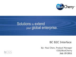 This document outlines the options and processes for BlueCherry's B2C interface. It discusses transmitting style master data, inventory, orders, shipment details and more between BlueCherry and a consumer-facing website. The interface can use EDI, XML, or flat file formats and various data transport methods. It also covers order management, updates, returns and invoice reconciliation to integrate BlueCherry's system with a website for direct-to-consumer sales.