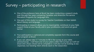 The document provides an agenda for a teacher candidate class that includes a picture book lesson presentation, connecting writing expectations to current events, professional learning communities, and an example lesson. It also previews what will be covered the following week, including an online forum post and professional learning community activities. Students are asked to complete a survey for an educational research study on literacy beliefs that is optional and separate from course requirements.