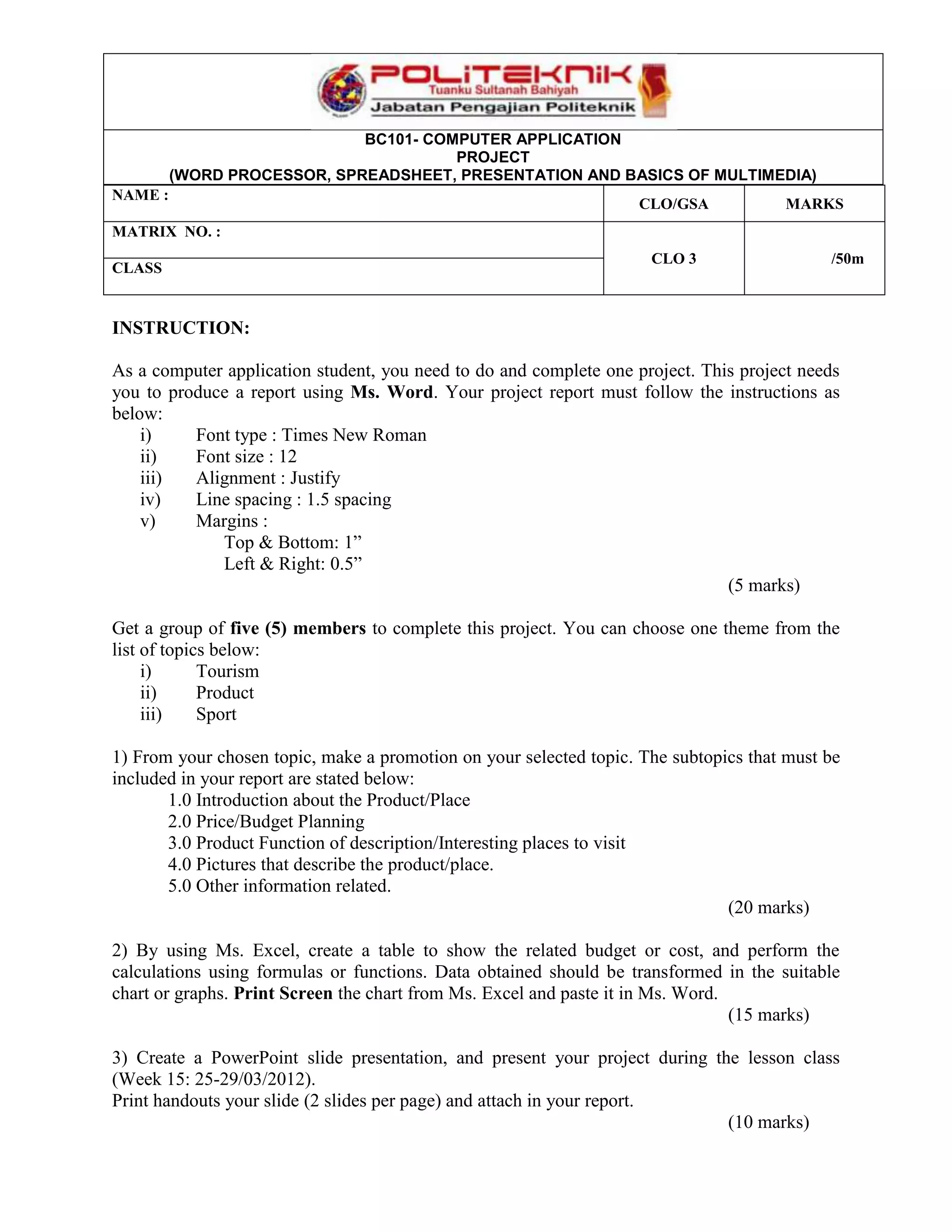 This document provides instructions for a computer applications project requiring students to create a report on a selected topic using Word, include an Excel table and budget calculations, and develop a PowerPoint presentation. The report must follow specific formatting guidelines in Word and include sections on introduction, pricing, description, pictures and other related information. Students will present their project and include printed PowerPoint slides in their final report.