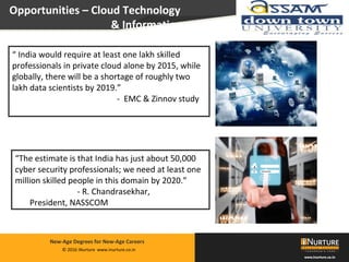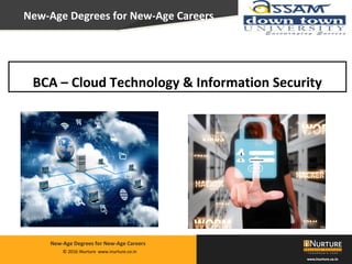 The document outlines a new Bachelor of Computer Applications (BCA) program focused on cloud technology and information security, addressing the significant demand for skilled professionals in India. It details the curriculum, which includes modules on ethical hacking, virtualization, and data centers, and emphasizes practical training to prepare students for industry challenges. Additionally, the program promotes partnerships with universities and a strong corporate network to enhance employability and provides 100% placement support for eligible students.