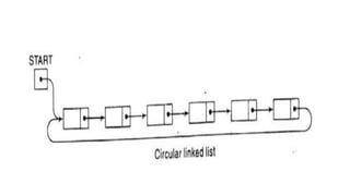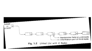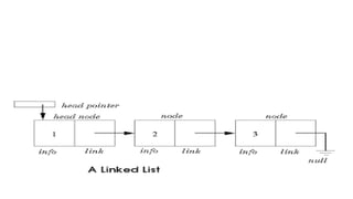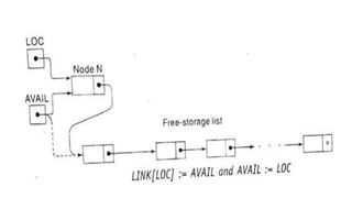 3. Common operations on linked lists include traversal, search, insertion at head/specific point, and deletion by adjusting pointers. Memory for new nodes comes from a free list, and deleted nodes return there.