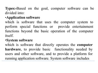 Computer software includes programs and data that are processed by computer systems. There are two main types: application software which performs special functions, and system software which operates the computer hardware and provides basic functionality. Key parts of system software include operating systems, device drivers, and utilities. Operating systems manage computer resources and provide common services for other programs. [END SUMMARY]