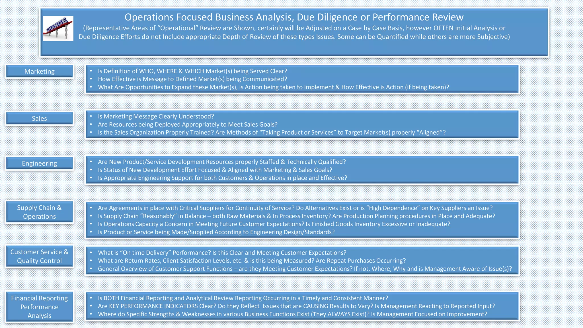 Business Change Advisors provides senior management consulting services to support business improvement. They utilize past experience leading change across industries to help clients improve performance. Services include operational assessments, strategic planning, expense reduction strategies, and merger/acquisition support. The goal is to identify specific opportunities to strengthen areas like marketing, sales, supply chain management, and financial reporting.