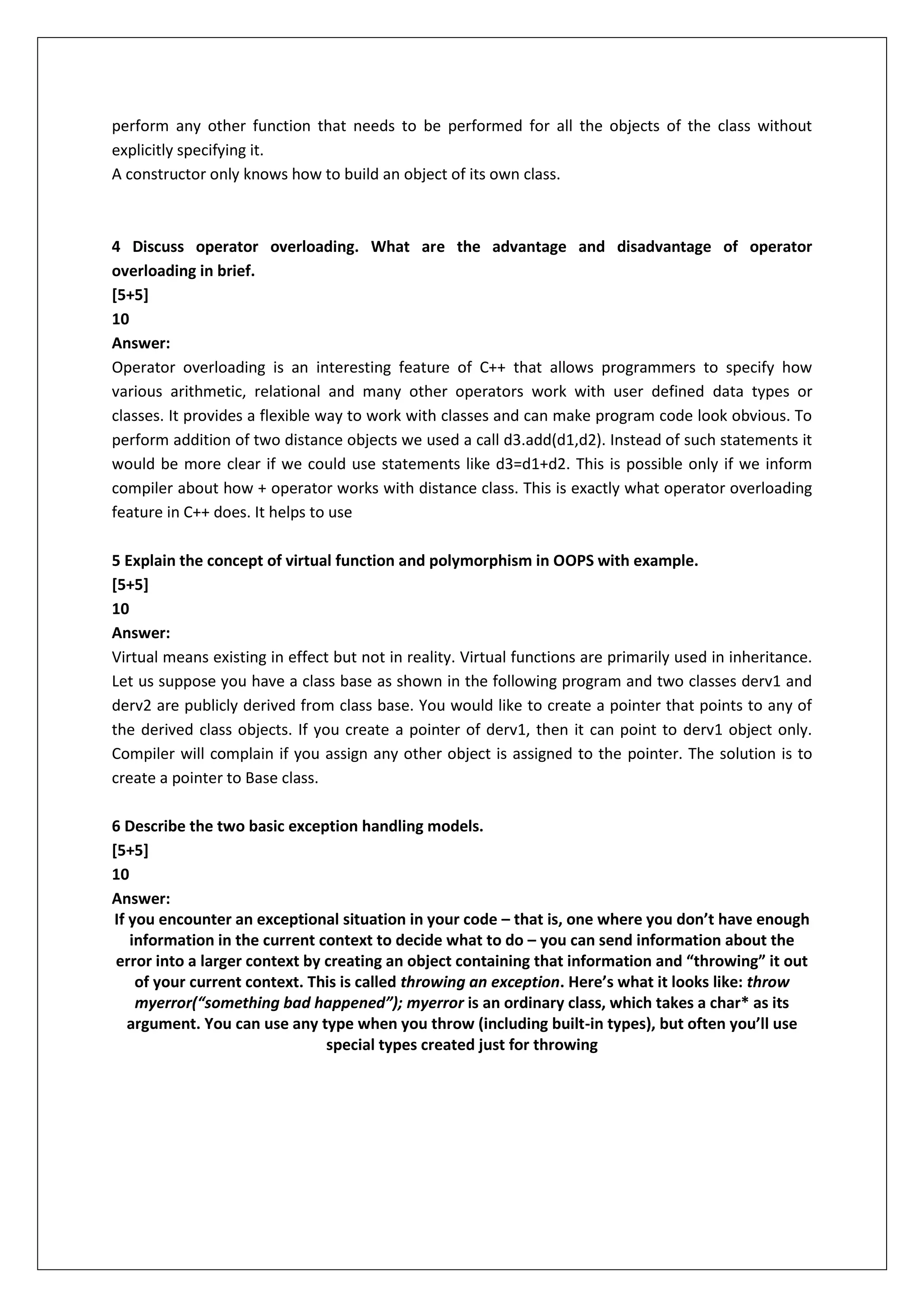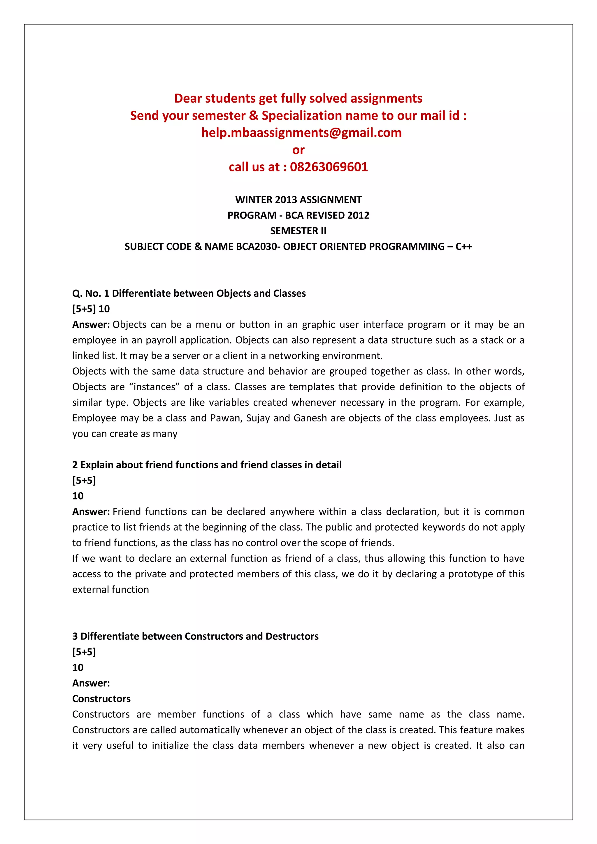 The document provides information about fully solved assignments for the winter 2013 semester in the BCA program. It lists the subject code and name as BCA2030 - Object Oriented Programming - C++. It provides 6 questions related to the subject and asks students to send their semester and specialization details to the provided email ID or call the given phone number to get the solved assignments. It provides answers to the 6 questions related to topics like objects and classes, friend functions, constructors vs destructors, operator overloading, virtual functions and polymorphism, and exception handling models.
