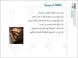 يتناول المستند دوافع واستشهاد الإمام الحسين عليه السلام، موضحًا أسباب الاهتمام بقضيته وأهداف ثورته. يتطرق إلى دوافع يزيد بن معاوية وجيش بني أمية لقتله، ويستعرض مآسي المعركة وتضحيات الإمام الحسين. يختتم بتفصيل أهداف الثورة الحسينينة في إحقاق الحق ومحاربة الظلم.