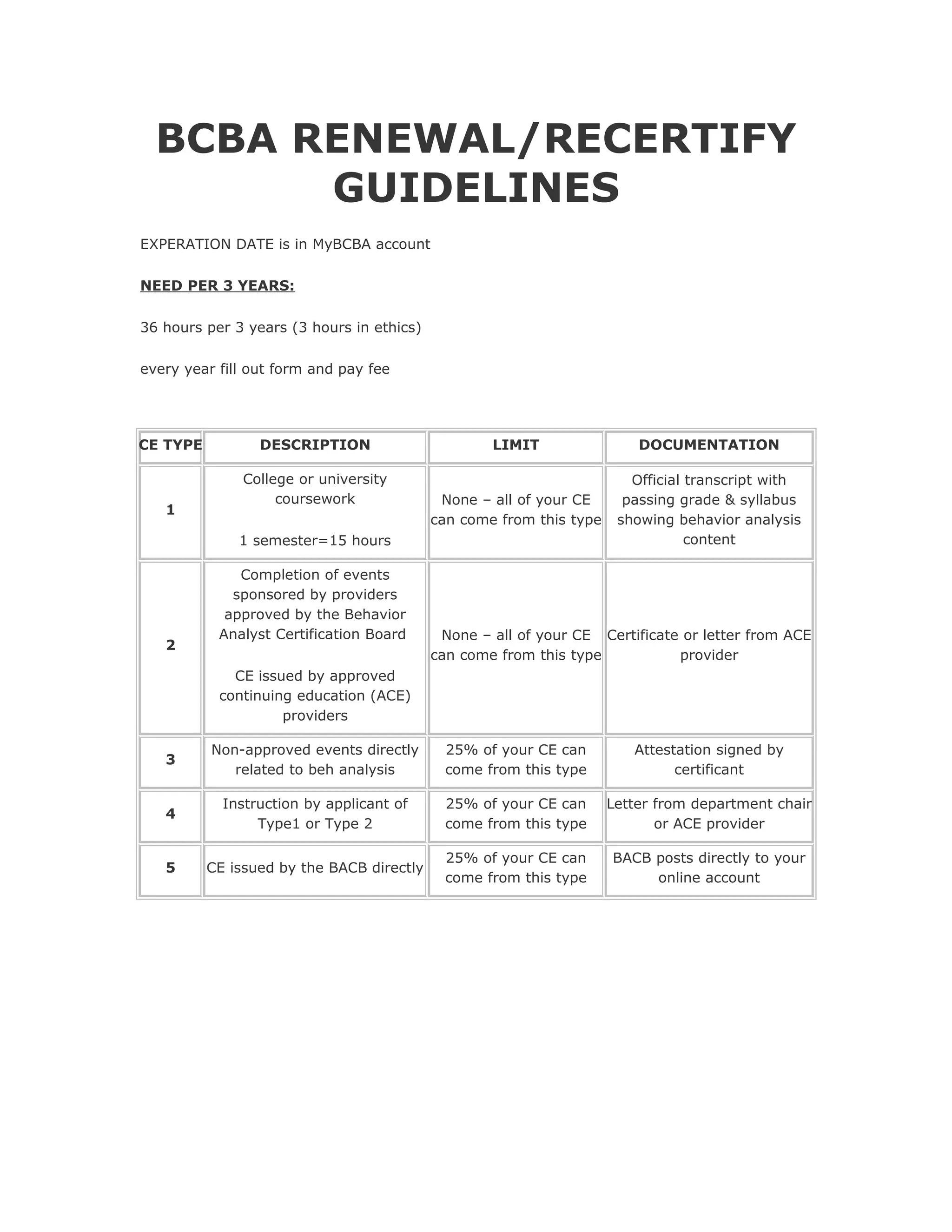 To renew certification as a BCBA, certificants must complete 36 hours of continuing education every 3 years, including 3 hours in ethics. This includes coursework, events sponsored by approved providers, non-approved events related to behavior analysis, instruction of other professionals, or continuing education directly from the BACB. Certificants must fill out a renewal form and pay the renewal fee each year to maintain an active certification status.