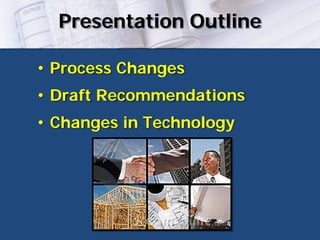 The presentation outlines proposed regulatory process changes and technological advancements aimed at streamlining the development review process. Key recommendations include expanding one-stop permitting, establishing a staff technical review committee, and enhancing electronic permitting systems for better access and efficiency. Future enhancements are suggested to improve customer notification, fee management, and public access to development-related information.