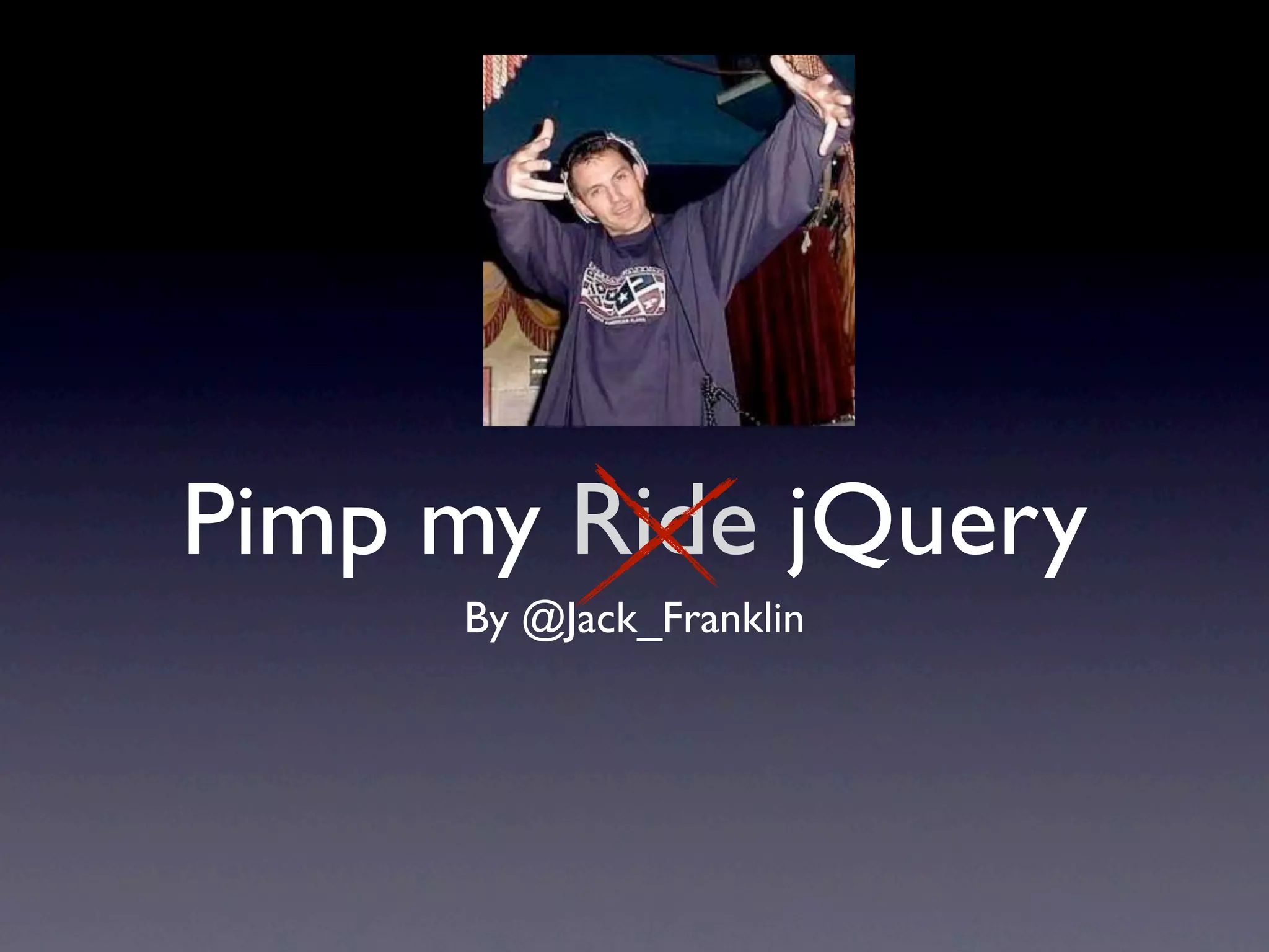 - The document discusses best practices for using jQuery, including loading jQuery from Google's CDN, using CSS selectors with jQuery traversal functions, chaining methods, using context, avoiding class selection, checking for element existence, running code on page load, and combining/minifying scripts. It provides tips on performance, readability, and cross-browser compatibility when working with jQuery.
