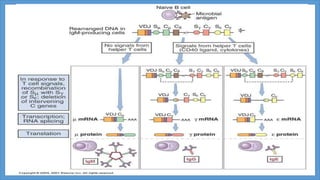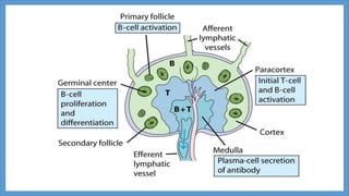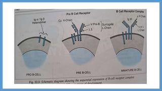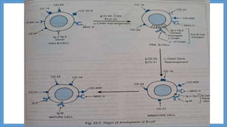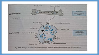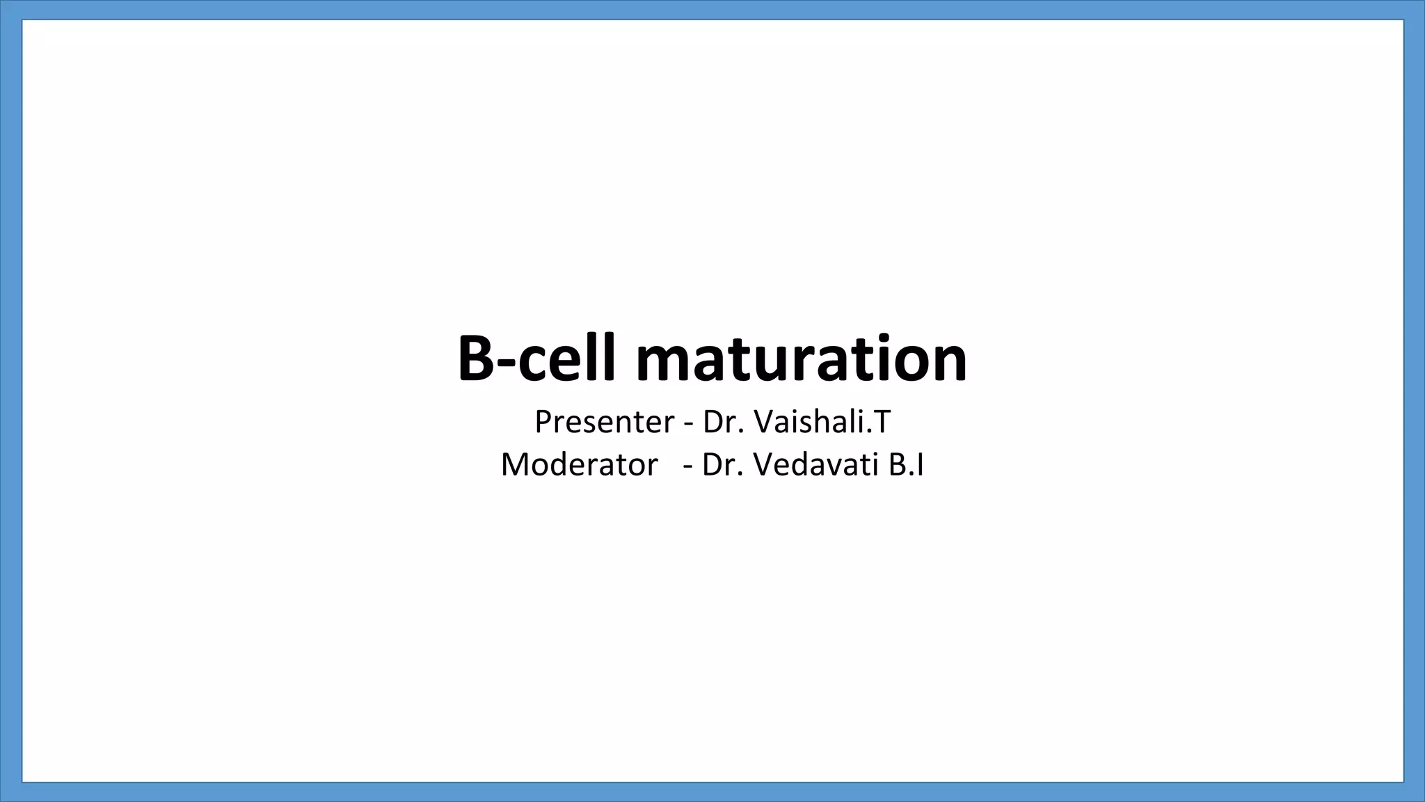 B-cell maturation begins with hematopoietic stem cells in the bone marrow, where they develop through pro-B cell, pre-B cell, and immature B cell stages. During this process, immunoglobulin genes undergo rearrangement and expression of B cell receptors occurs. Immature B cells then migrate to secondary lymphoid tissues to complete maturation. Mature B cells circulate and are activated by antigen to proliferate and differentiate into plasma cells or memory B cells through T cell dependent or independent pathways. T cell dependent activation induces affinity maturation, class switching, and generation of long-lived memory B cells.