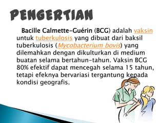 Vaksin Bacille Calmette-Guérin (BCG) digunakan untuk mencegah tuberkulosis (TB), yang disebabkan oleh Mycobacterium tuberculosis. Indonesia merupakan negara dengan prevalensi TB tinggi, sehingga imunisasi BCG diwajibkan dan pengobatan TB harus dilakukan selama minimal 6 bulan dengan disiplin. Gejala TB meliputi batuk lama, demam berulang, dan penurunan berat badan serta memerlukan diagnosis melalui rontgen dan tes darah.