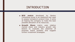 The BCG matrix, developed by the Boston Consulting Group, is a strategic tool that helps companies assess their product lines based on market share and growth rate to optimize resource allocation. It categorizes products into four groups: question marks, stars, cash cows, and dogs, each requiring different investment strategies. While the matrix offers a clear framework for decision-making, its limitations include reliance on only two dimensions and potential confusion for products that do not fit neatly into categories.