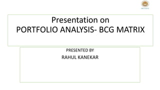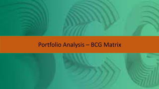 This document presents a portfolio analysis of Nestle products using the BCG matrix. It introduces the BCG matrix, its elements, advantages and limitations. It then analyzes Nestle's mineral water, milk pack, noodles and juices products, categorizing them in the BCG matrix based on their relative market share and growth. Mineral water is a star, milk pack is a cash cow, noodles are a question mark, and juices are a dog. The conclusion recommends focusing investment on stars, maintaining cash cows, carefully examining question marks, and potentially divesting dogs.