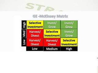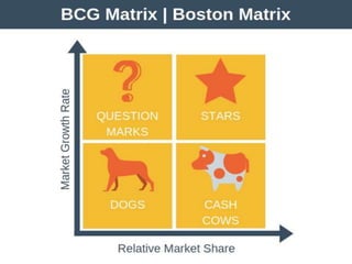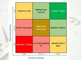 The document discusses the importance of product portfolio management in corporate strategy, emphasizing the need to align products with market demands to enhance business performance. It introduces the BCG matrix as a tool for classifying products based on market share and growth rate, guiding investment decisions for optimal resource allocation. Additionally, it compares the BCG matrix with the GE matrix, highlighting their advantages and disadvantages in evaluating product portfolios.