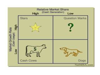 The document summarizes the Boston Consulting Group (BCG) matrix, a portfolio management tool developed in the 1970s. The BCG matrix evaluates products based on their market share and market growth. It categorizes products as Stars, Cash Cows, Question Marks or Dogs. Stars are high growth, high share products that require investment. Cash Cows are low growth, high share products that generate cash. Question Marks have high growth but low share, requiring investment. Dogs have low growth and share and should be avoided or harvested. The matrix helps companies allocate resources but has limitations like neglecting synergies between units.
