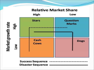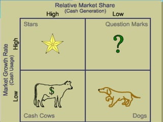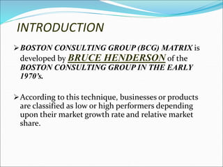 This document provides an overview of the Boston Consulting Group (BCG) Matrix, which classifies businesses into four categories based on their relative market share and market growth rate. The four categories are stars (high share, high growth), cash cows (high share, low growth), question marks (low share, high growth), and dogs (low share, low growth). The BCG Matrix is used to assess a company's portfolio, allocate resources, and make divestment decisions. It provides a simple framework but has limitations in only considering two factors and difficulties obtaining accurate data. Major companies still find it a useful portfolio planning tool.