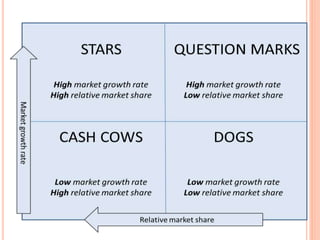The BCG matrix is a portfolio analysis tool used to evaluate business units or product lines based on their relative market share and market growth. It categorizes products as Stars, Cash Cows, Question Marks or Dogs. Stars are high market share products in high growth markets, while Cash Cows have high share but in slow-growing markets. Question Marks have low share but are in high-growth markets, while Dogs have low share and are in slow-growth markets. The matrix is used to assess relative cash usage and allocation across a company's portfolio to maintain a balanced mix of these categories for long-term growth and profitability. It provides a framework to determine which products require investment, harvesting or divestment. However,