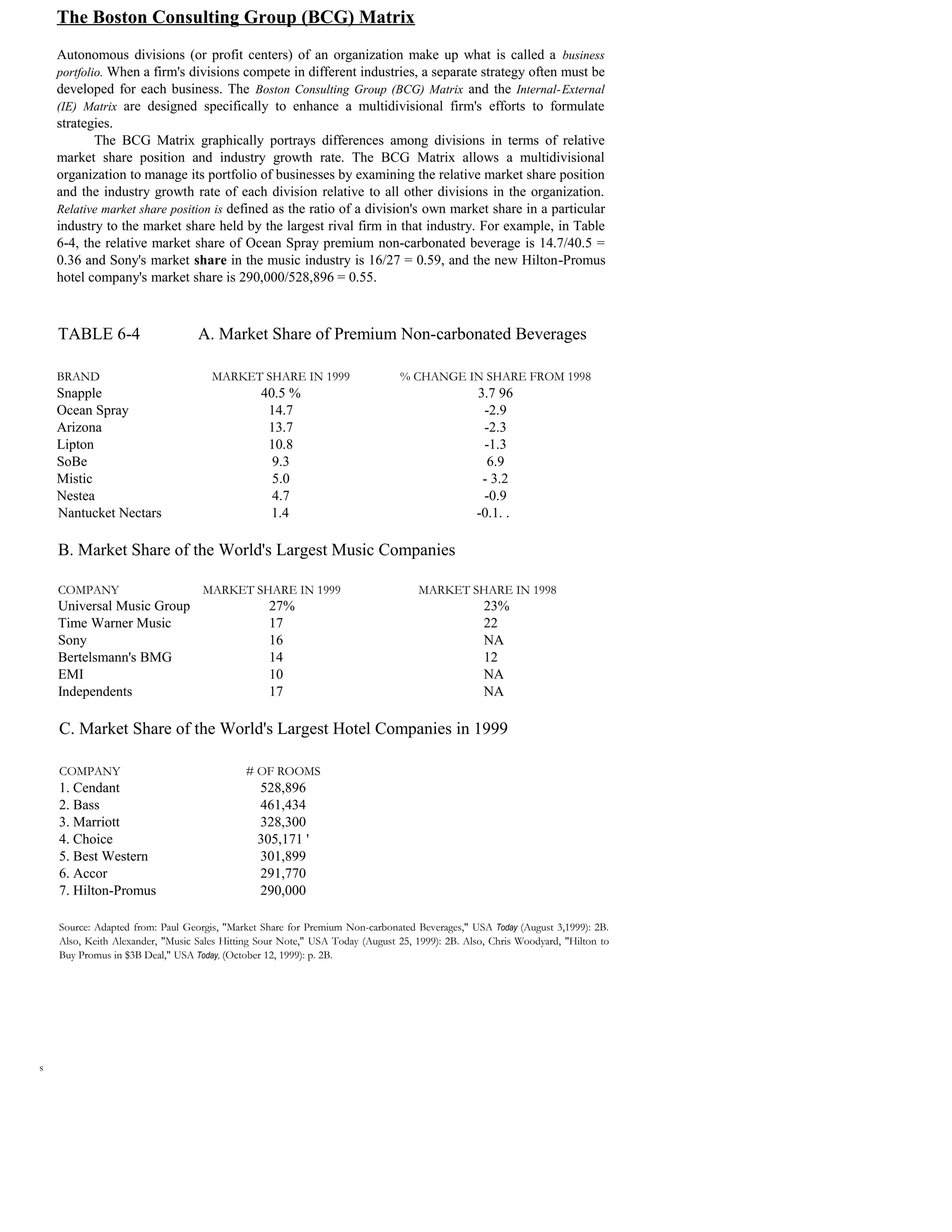 The document discusses the Boston Consulting Group (BCG) Matrix, which is used to analyze a company's portfolio of business divisions. It graphs divisions based on their relative market share on the x-axis and industry growth rate on the y-axis. Divisions fall into four categories: Stars (high share, high growth), Cash Cows (high share, low growth), Question Marks (low share, high growth), and Dogs (low share, low growth). The matrix is used to determine which divisions a company should invest in, milk for cash, consider divesting, or implement a turnaround strategy for. It provides a framework to develop customized strategies for each division based on its placement in the matrix.