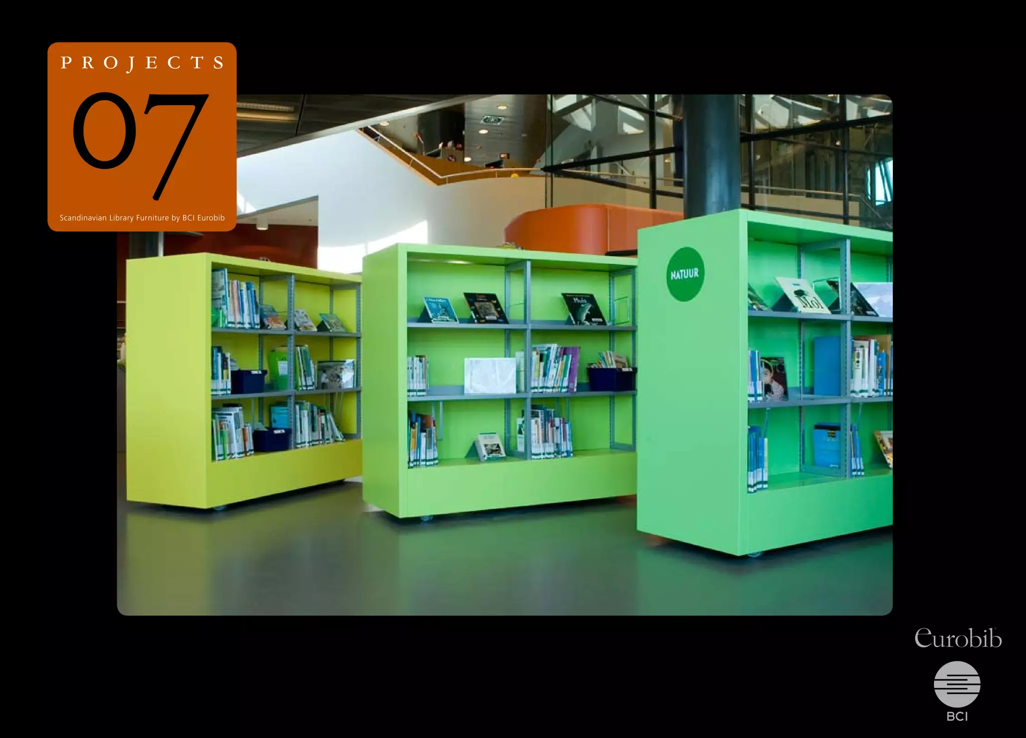 The document provides information about library furniture projects completed by BCI Eurobib in 2007. It summarizes projects in Barcelona, Stamford, Heerhugowaard, Poissy, Copenhagen, and Redon. BCI Eurobib is a world leader in library interiors with over 60 years of experience developing furniture and furniture systems for libraries.