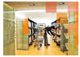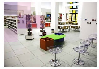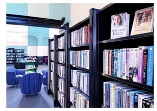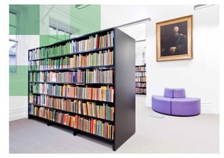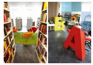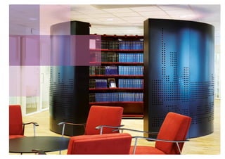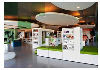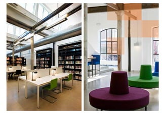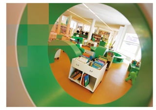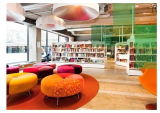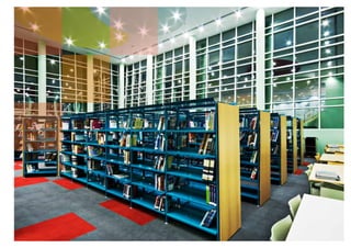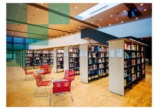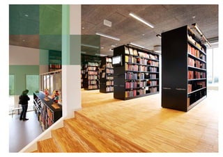 This document profiles 14 library projects from around the world. It summarizes each project in 1-3 sentences, highlighting key details like the location, architect, and design features. The projects showcase the company's work in creating innovative, functional solutions for modern libraries. Photos accompany each summary, showing the interior designs which utilize various shelving and lighting products to create inspiring learning environments.