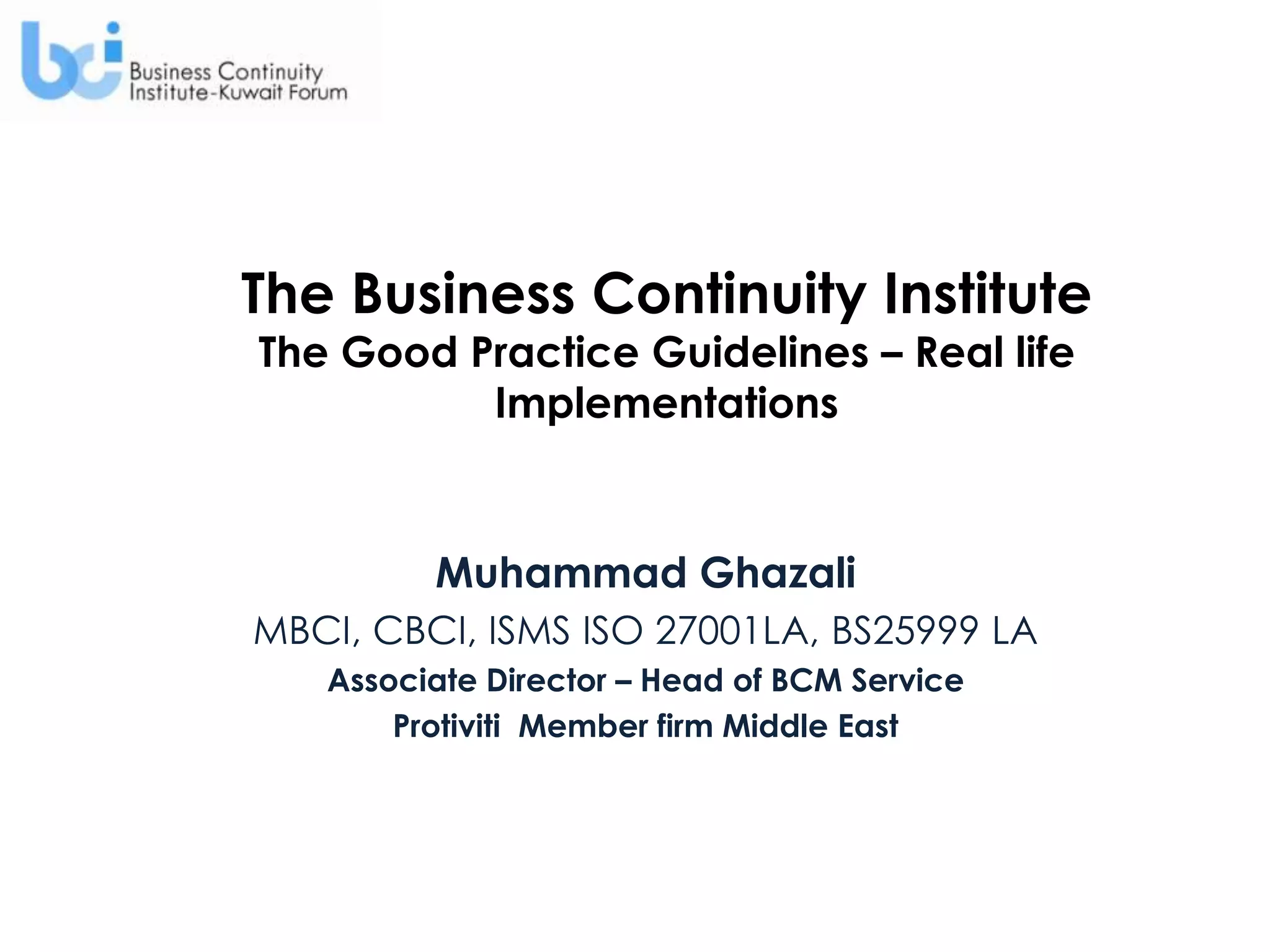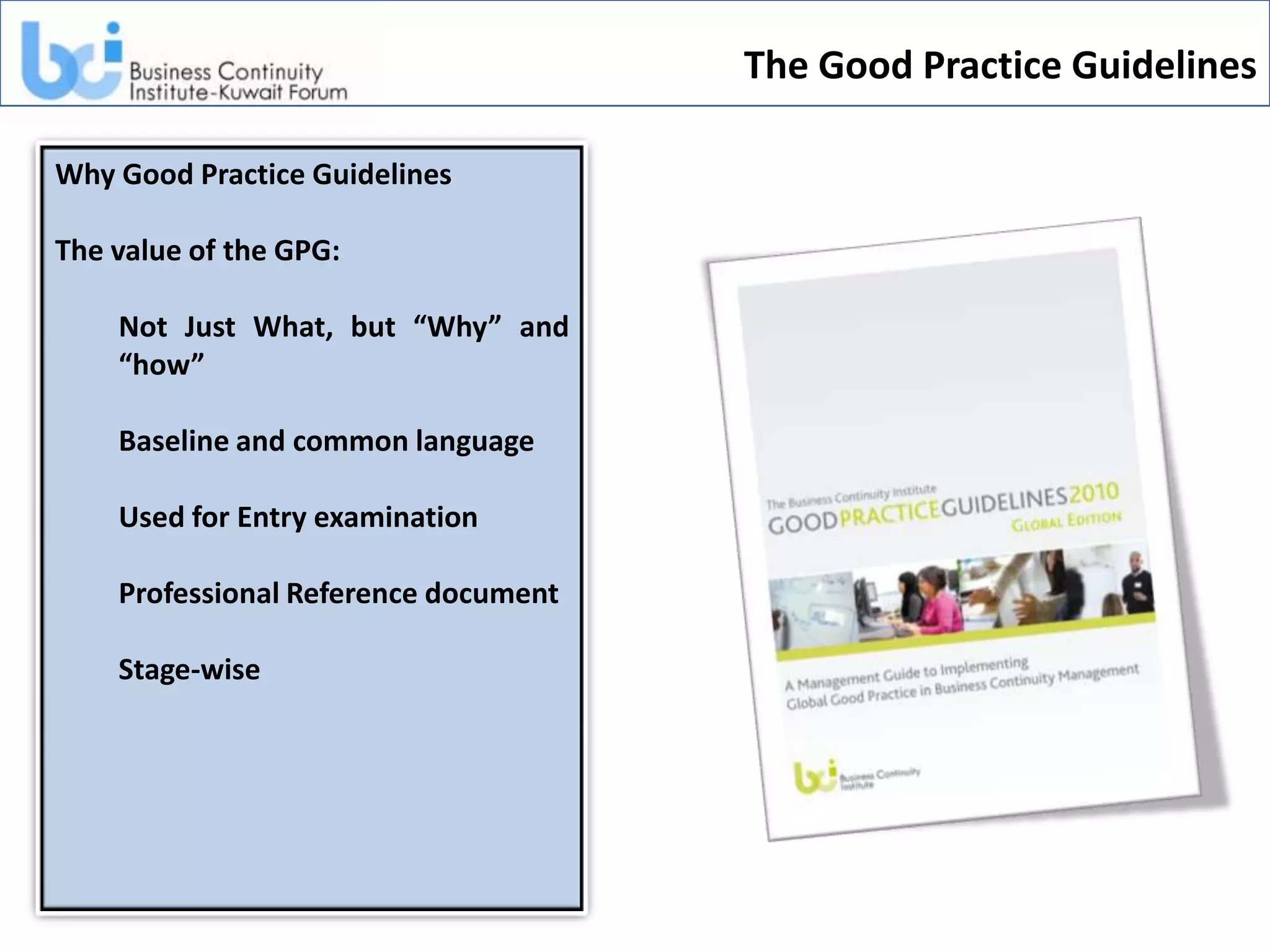 1. The document discusses guidelines for establishing business continuity programs called the Good Practice Guidelines (GPG).