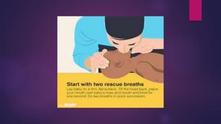 This document provides guidelines for performing basic cardiac life support (BCLS) for infants and children. It outlines the steps to take which include checking for responsiveness and safety, opening the airway, giving rescue breaths, checking for a pulse and administering chest compressions if needed. For infants less than 1 year old, compressions are given using two fingers placed below the nipple line at a rate of 100 per minute. For children 1-7 years, compressions are given with one hand using the heel placed above the nipple line at a rate of 80-100 per minute. Rescue breaths are given at a rate of once every 3 seconds for infants and once every 4 seconds for children.
