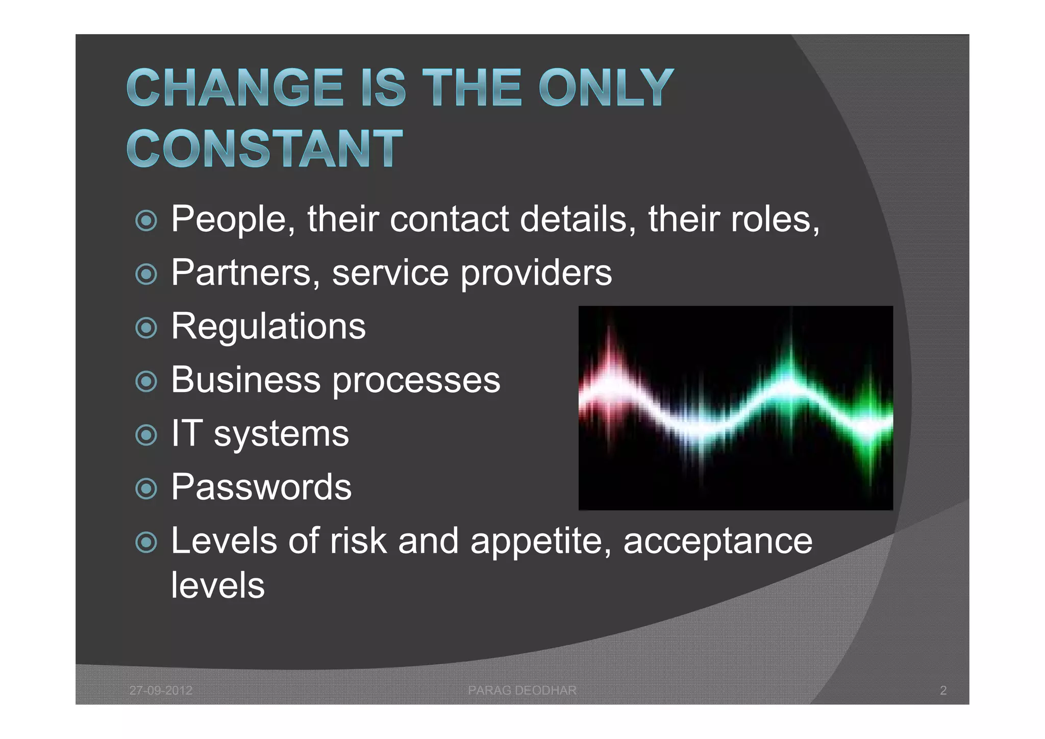 The document discusses business continuity management (BCM) and the importance of metrics, audits, and testing. It states that metrics are needed to measure maturity, audits internally and externally help increase awareness and oversight, and testing plans according to success criteria finds areas for improvement. All BCM should follow the Plan-Do-Check-Act model for continuous growth and be assessed based on objectives, context, and best practices/standards.