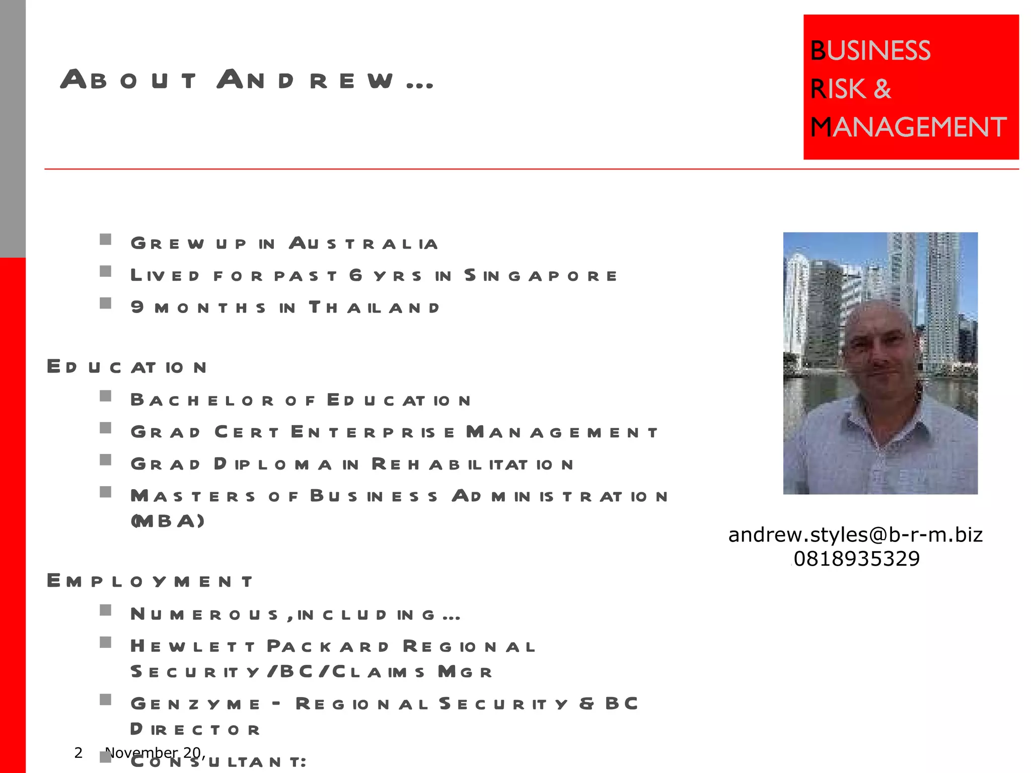 The document provides an introduction to business continuity management (BCM). It discusses the need for BCM given recent events that have negatively impacted organizations. BCM aims to limit the effects of a crisis by ensuring continuous operations during disruptions. The document outlines common types of disruptive events and discusses BCM standards and certification. It also notes that the majority of companies without BCM programs fail within a year of experiencing a major disruption.